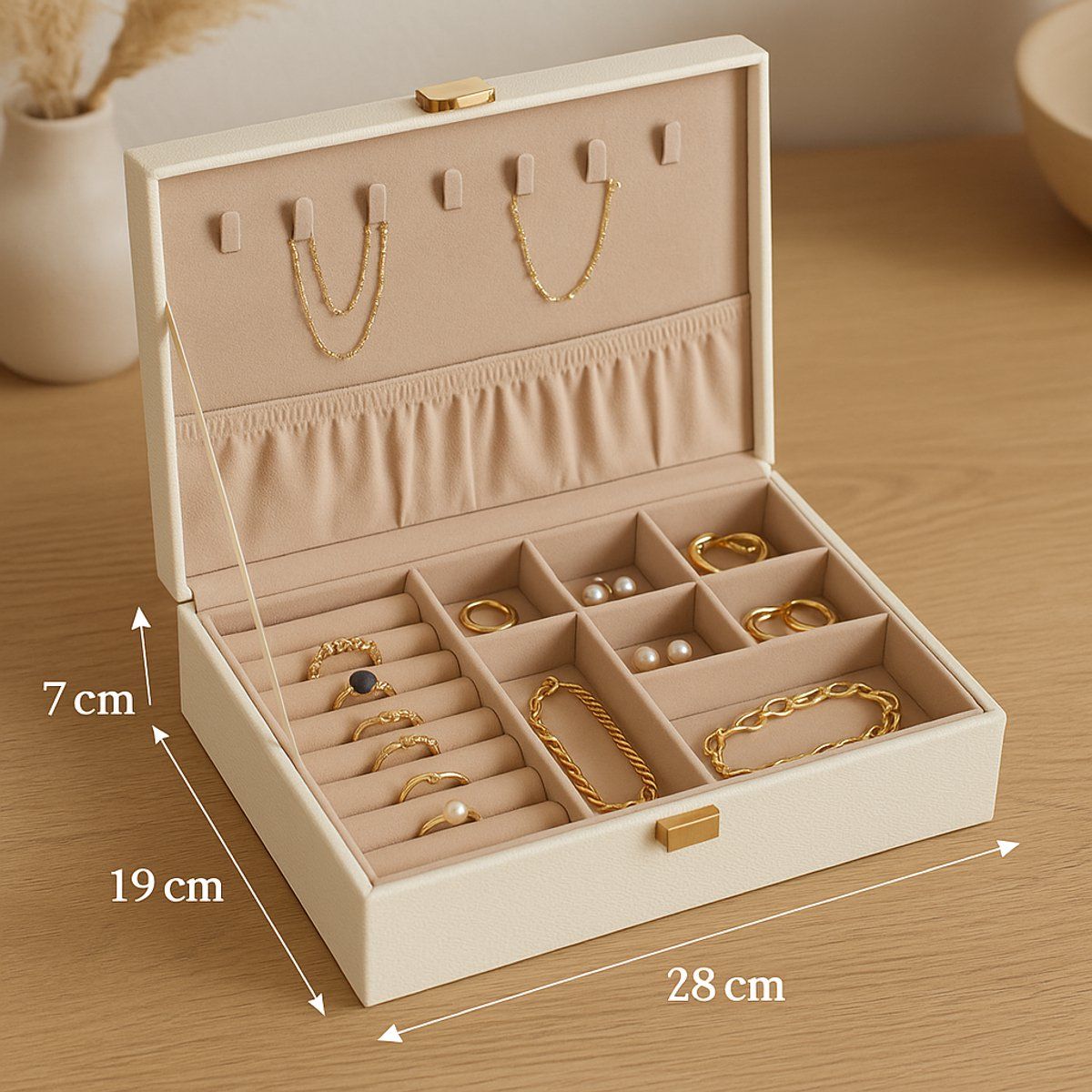 - 7 compartimenten voor het opbergen van bv ringen of oorbellen